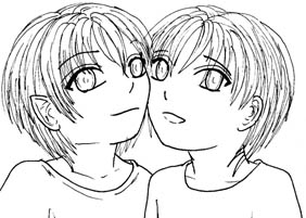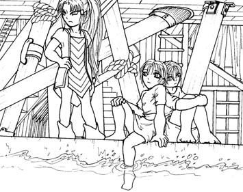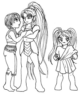 Quelques gamins courent le long du quai , plongent dans l'eau sombre et éclaboussent au passage trois autres enfants qui jouaient non loin. La petite fille blonde secoue la tête avec colère. Elle est fine et possède les traits caractéristiques des elfes: oreilles pointues, yeux scintillants d'étoiles. Une solide musculature vient s'accrocher sur son ossature fine et joue sous sa peau brune. Son nom est Pyronée. Les deux autres enfants secouent leur cheveux noirs et coupés courts pour en faire tomber les gouttelettes d'eau. Il y a là un garçon et une fille, des jumeaux un peu plus jeune que Pyronée. Jumeaux presque parfait, mais il est elfe, elle est humaine. Bien que leurs yeux aient la même couleur bleue sombre, les étoiles brillent en nombre dans ceux de Tial, et peu brillent dans ceux de Yuuki. Il est elfe éternel aux oreilles pointues, elle est humaine éphémère aux oreilles rondes, mais ils sont frères et sœur, inséparables.